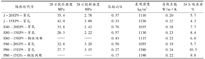 從輕質(zhì)骨料混凝土種類和層面聯(lián)接方式改變時,復(fù)合隔熱磚相關(guān)性能的結(jié)果可以得出,由于在EPS板和混凝土面層間形成了連通的水泥砂漿柱,當(dāng)試件承受抗折荷載時,大部分試件折斷面經(jīng)過處于中間的三個水泥砂漿柱,水泥砂漿柱的抗折強度遠高于EPS板的抗折強度,因此與試件的抗折強度相比,基準試件抗折強度均有較大幅度的提高,但相應(yīng)試件的抗壓強度卻有降低,這也進一步說明EPS板的抗壓塑性有助于提高復(fù)合隔熱磚的抗折強度。