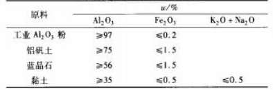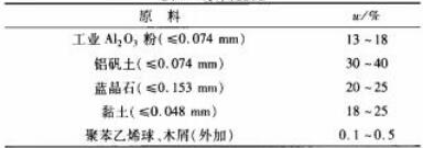 以工業Al2O3粉、粘土、燒結出色的鋁礬土和部分藍晶石為首要質料,增加木屑(1mm挑選)和聚苯乙烯球(直徑2~0.5mm)制備輕質磚。質料化學組成見表1